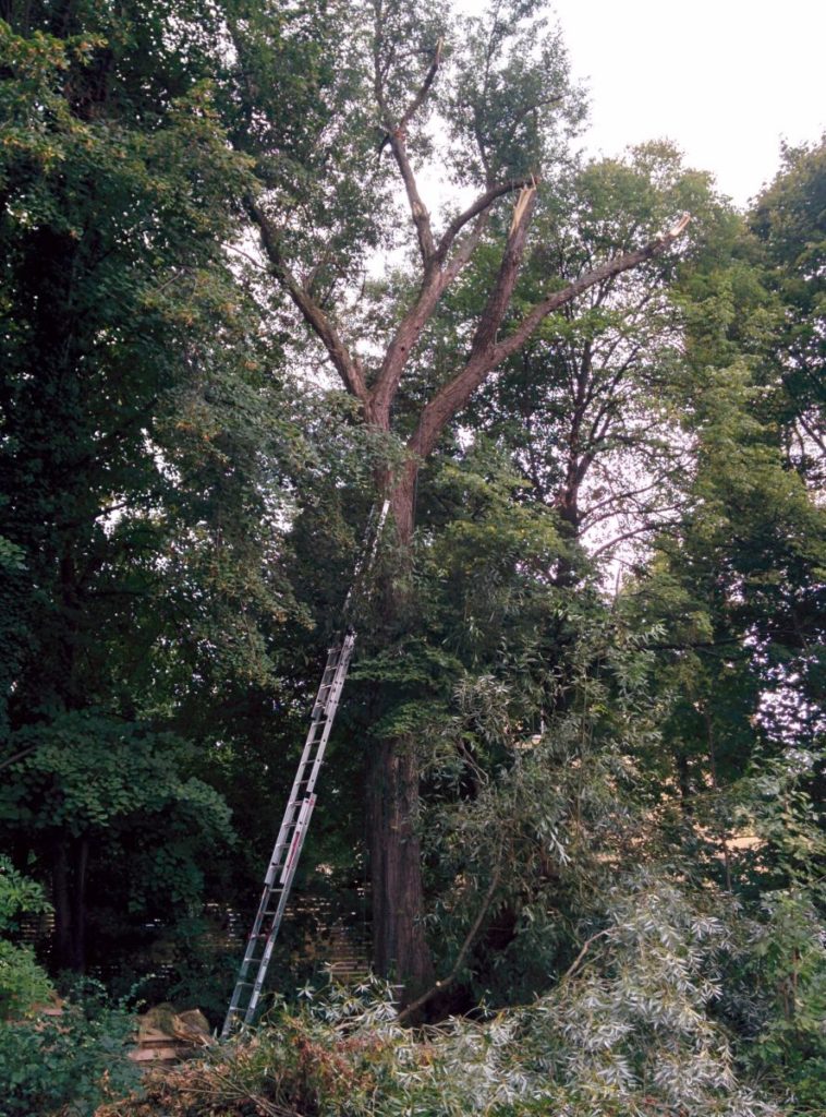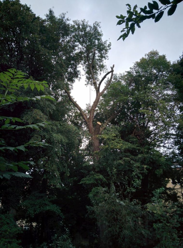 Für den dicken Schnitt habe ich mir kurz die Kettensäge hoch gezogen. Alle Nachbarn schauten zu wie ich mich ohne Schnittschutz oder Helm da oben mit der Säge plagte 🙂