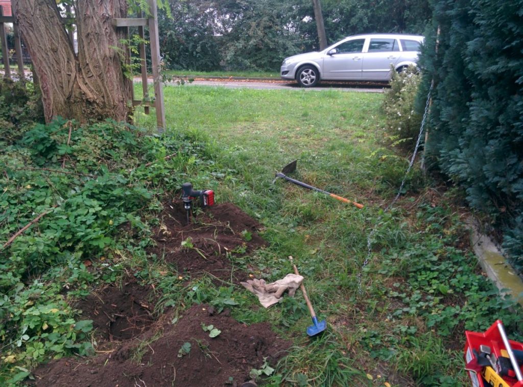 Die Sondierung, ein voller Erfolg. Beton bis zum Tor und bis an den Baum heran. Das schafft Argumente für weitere Verhandlungen.