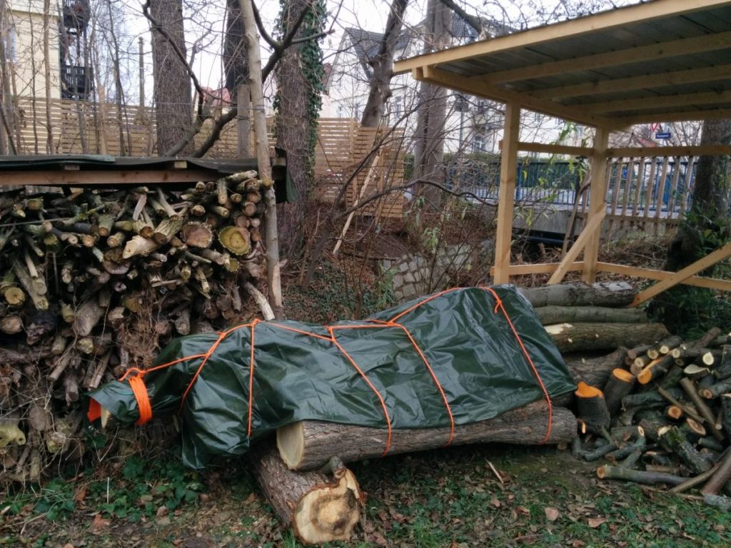 Die paar Sonnenstunden genutzt, um die Krone der Robinie mit der Machete zu zerpflücken und die Robinienstämme Winterfest eingepackt (vielleicht etwas unkonventionell verschnürt, aber es hält sehr gut und die Plane liegt spannungsfrei.). Ich habe ja Ideen, wie sie am Haus ein zweites leben erhalten könnten.