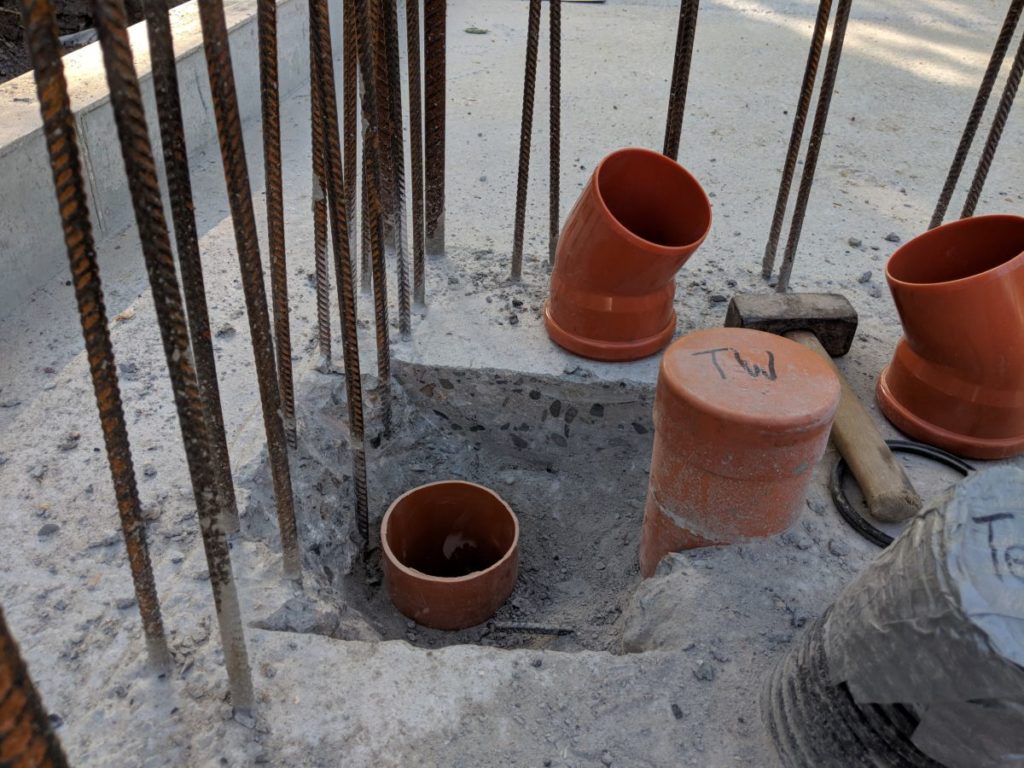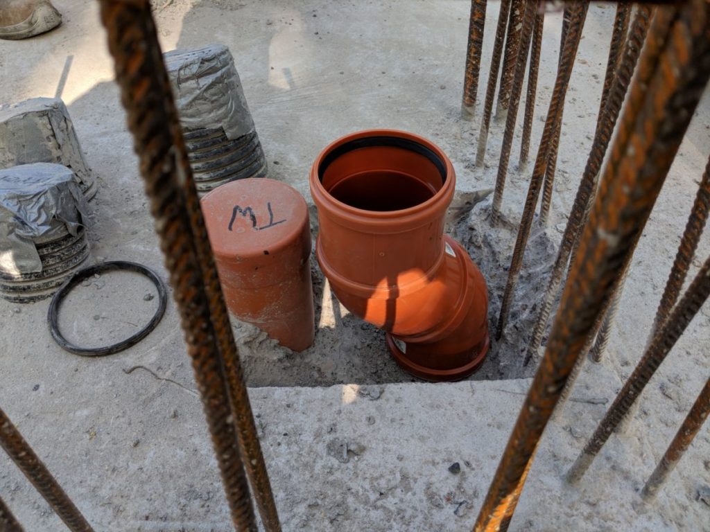 Ab jetzt muss alles um die Ecke. Die Muffen zeigen entgegen der Fließrichtung, was angeblich egal sein soll, aber innen sind die Übergänge deutlich zu spüren. Hoffen wir, nicht so viel Hängen bleibt und dass die Kloake die Ritzen zu kleister, bevor die Gummis undicht werden. Andererseits steckt alles in Wasserdichtem Beton – so soll die Scheiße hin?