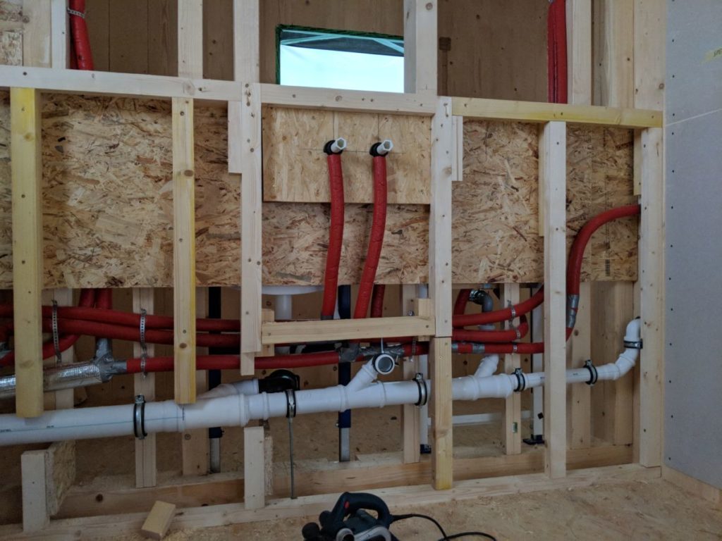 Die Vorgesetzten Trockenwände stehen im wesentlichen. Auch die Trennwand zwischen Vorratsraum und WC ist gestellt. Unsere einzige Installationswand ist vollgestopft mit Installation – die Kabel und Solarthermie-Rohre fehlen noch im Wirrwarr.