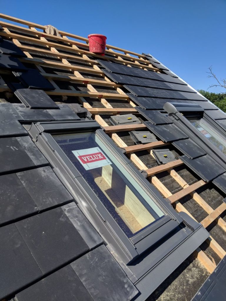 Deckenanstrich, noch schnell, bevor der Gipskarton kommt. Im Untergeschoss haben wir den Punkt durch zu langes überlegen leider verpasst und müssen später nochmal die Wände abkleben. 60 Quadratmeter über Kopf – zum warm werden.