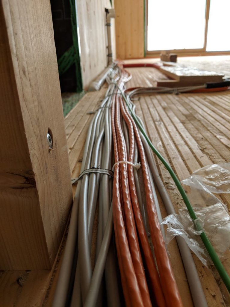 Strukturiert Verkabelung mit CAT 7 Kabel. Das Zeug kommt gleich als Doppelstrang von der Rolle… einem schnellen Netzwerk steht nichts im Wege – W-LAN bleibt optional.