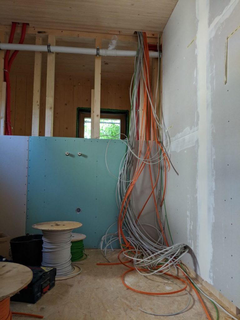 Ein paar zusätzliche KNX-Bus Kabel habe ich mir heute noch gewünscht. Ausgelegt sind sie schnell, wenn der Fußboden noch offen ist und der nette Kerl macht das einfach so… Zeit für ein Trinkgeld.