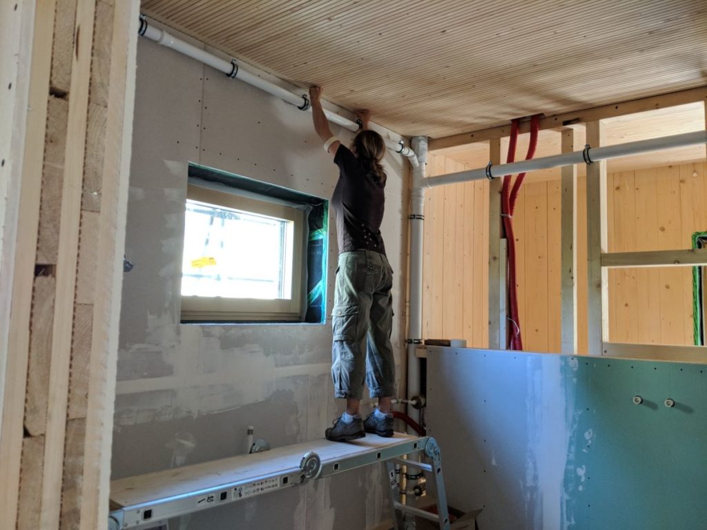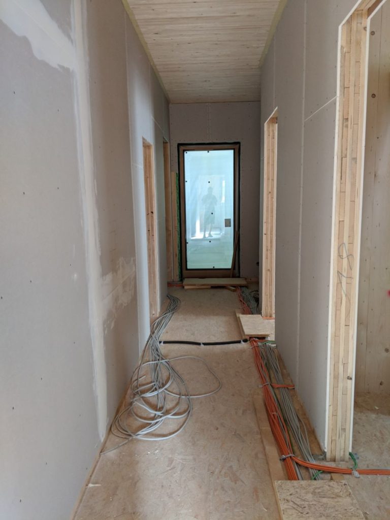 61. Tag – Gipskarton im ersten OG Kinderzimmer sind vollständig mit Gips beplankt. Im Heizraum wird schon die Decke abgeklebt.