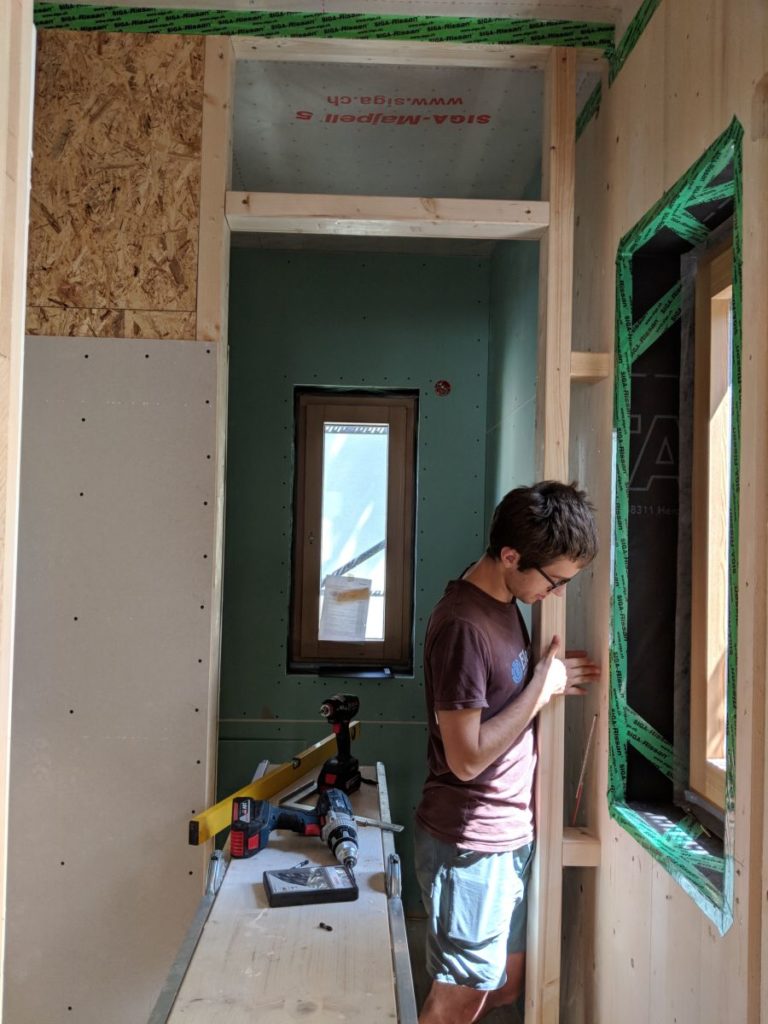 Noch ein paar neue Balken in die Wand gezogen. Noch muss die Wand offen bleiben, bis die PVT-Rohre installiert sind.