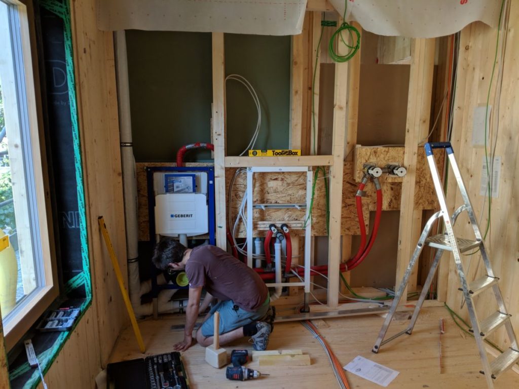 Weiter ging der Spaß mit dem Ausrichten der Vorwandelemente, hier hat es sich der Sanitär-Mann auch etwas einfach gemacht. Rückblickend hätte ich die Dinger Problemlos allein aufstellen können, im Vorfeld hatte ich da etwas mehr Bedenken.