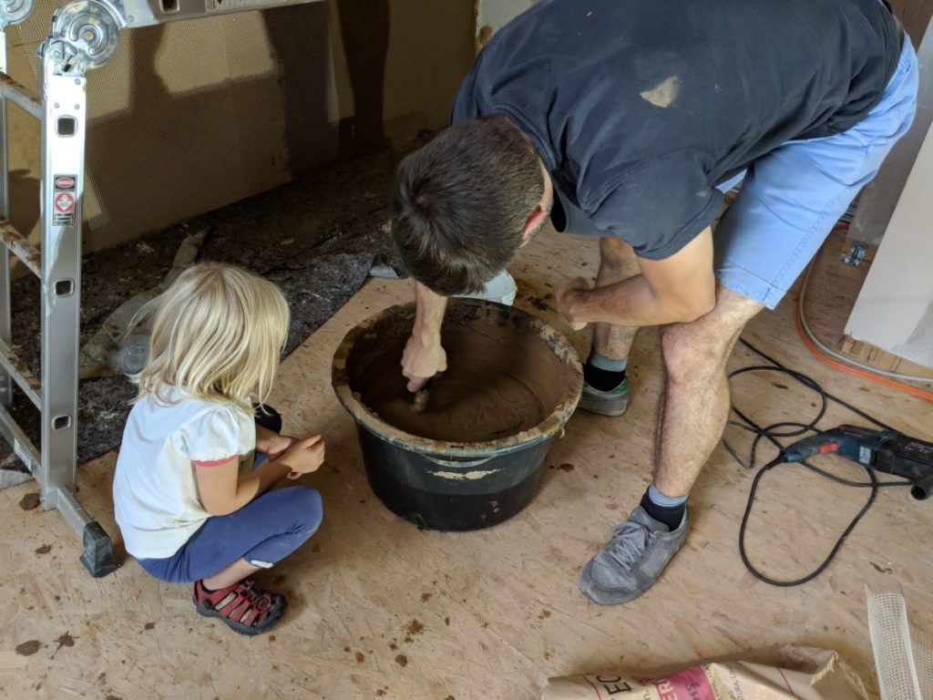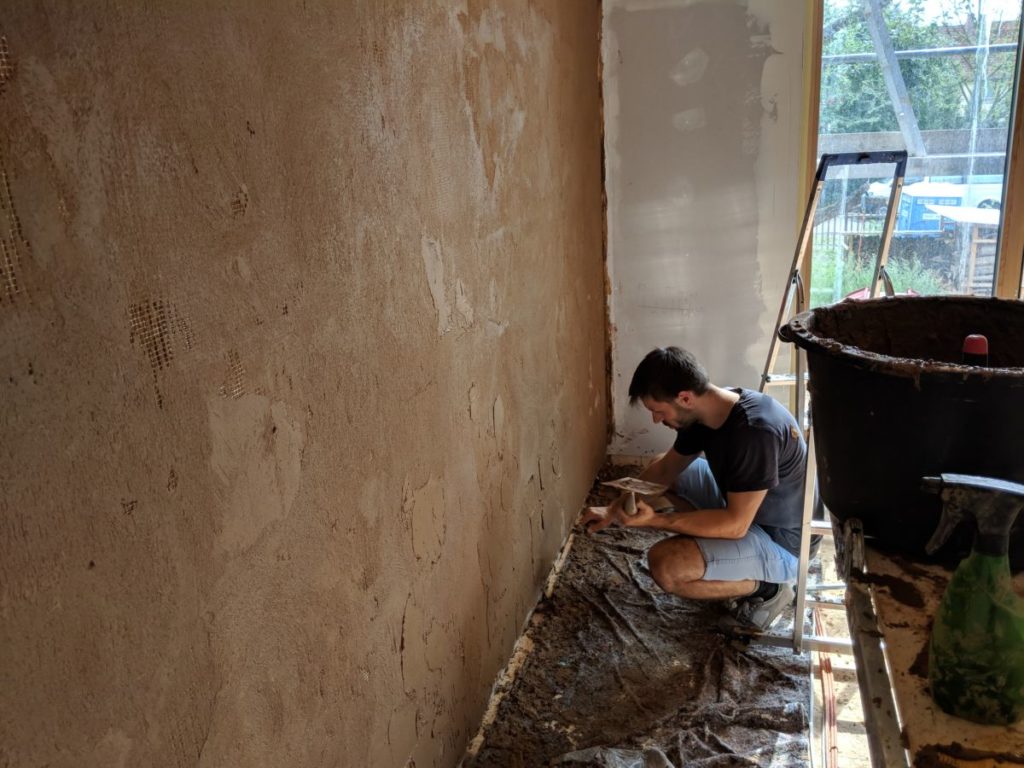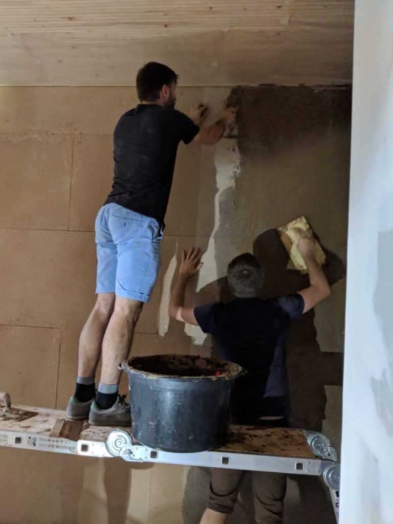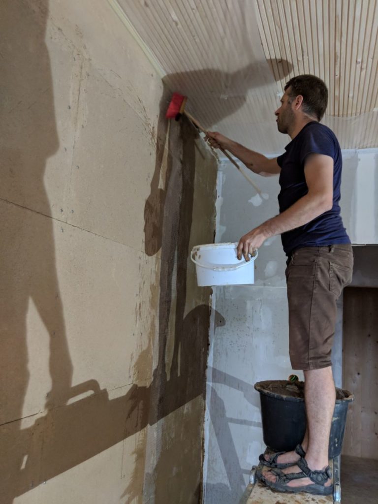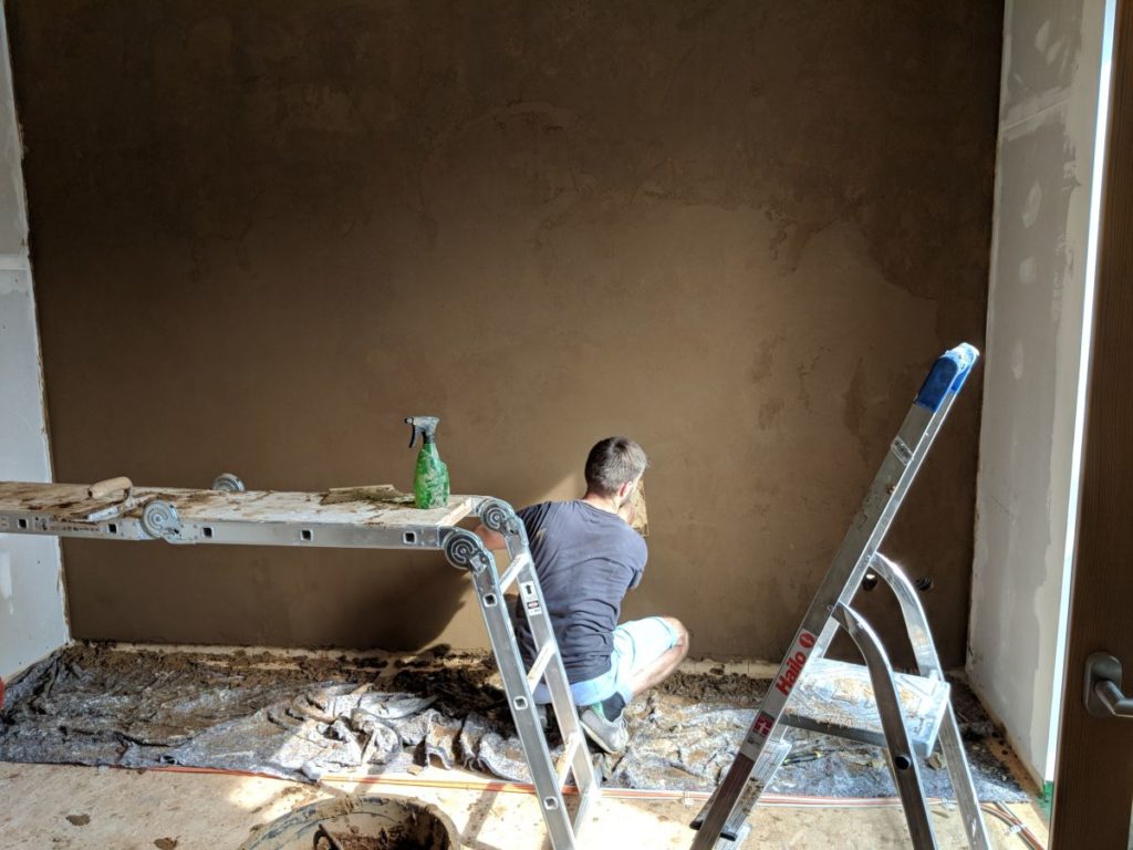 Die erste Wand ist braun, aber es ging nicht gut und wir haben zu viel Material verschmiert. Die Zahnkelle geht gar nicht, da im Lehm Flachsfasern sind. Und das Zeug wird ständig zu trocken. Da merkt man wieder wie hervorragend der Gipsspachtel flutscht, dank beigemengter Kunststoffe oder so.