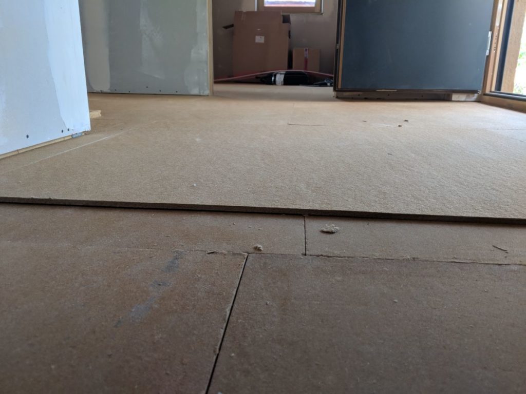 Die weite Dämmplatte kommt auf den Fußboden. Das ging schnell, da keinerlei Aussparungen mehr nötig sind.