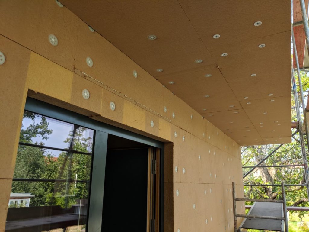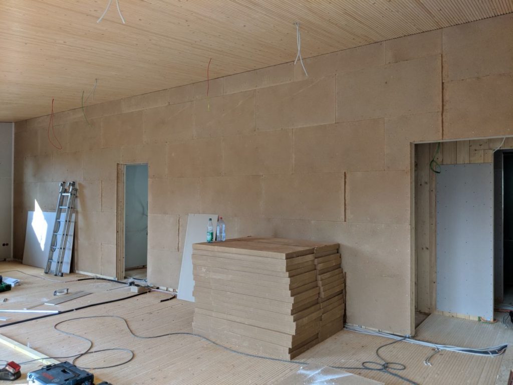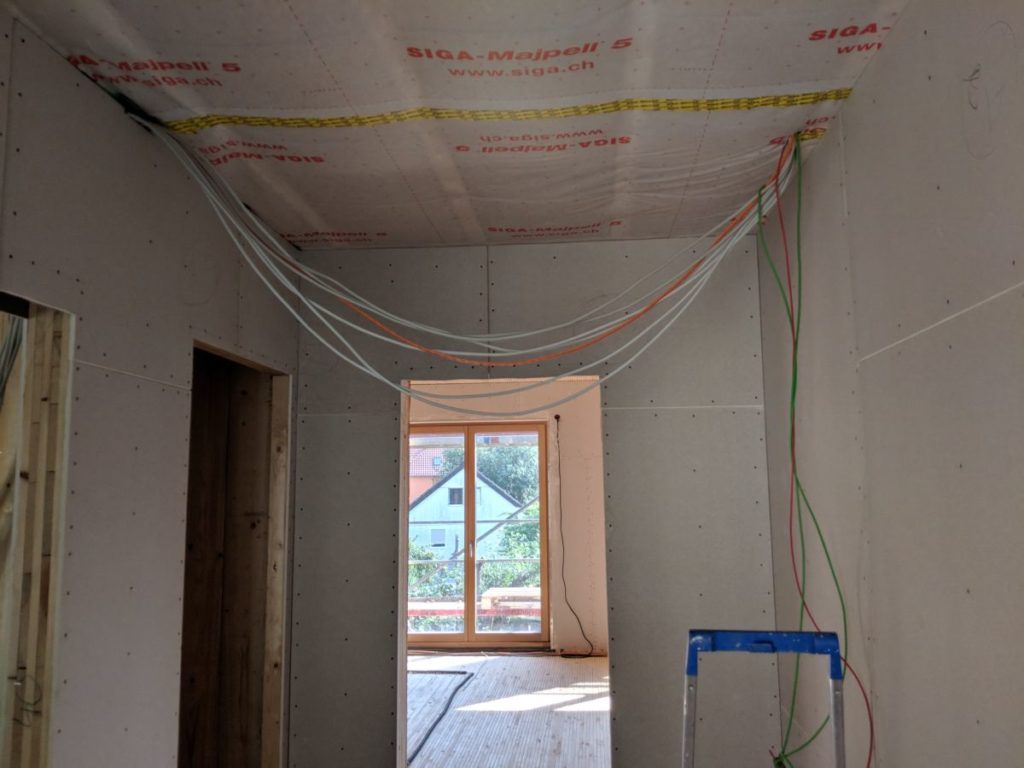 Die Dämmung im Eingangsbereich ist dran. Wir hatte uns aus Platzgründen auf eine 100 mm Dämmung (statt 120 mm) entschieden, welche nur verputzt wird. Jetzt ist die Decke auch nur 100 mm, obwohl es dort kein Platzproblem gitb – explizit wurde dies nie besprochen, aber es schein mir unnötig dort an der Dämmung zu sparen.