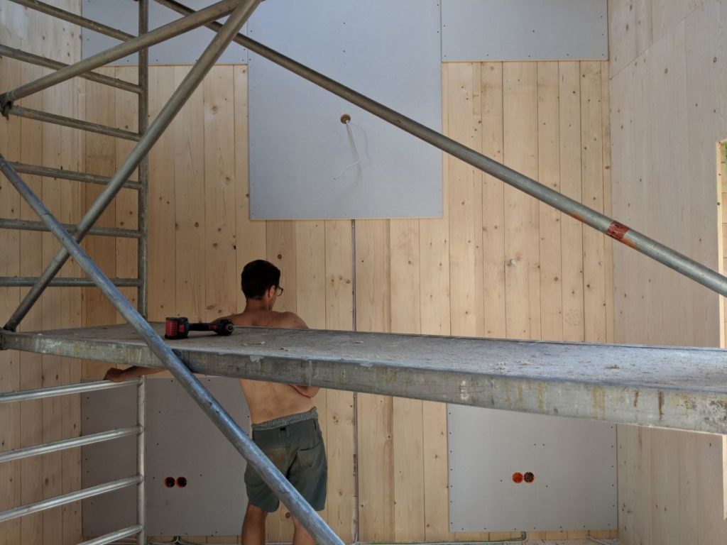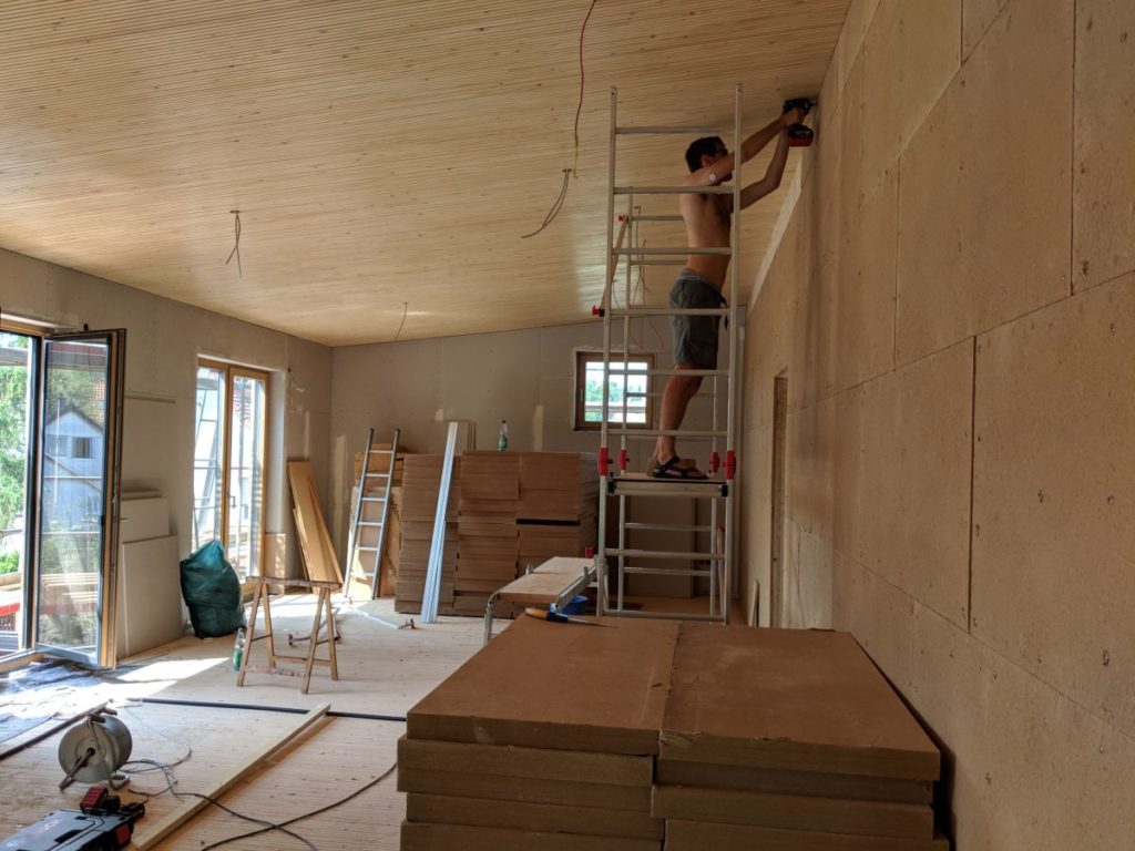 Auf unser Drängen hin, ist jetzt endlich die Decke abgeklebt worden. Startschuss für das Beplanken der Wand.