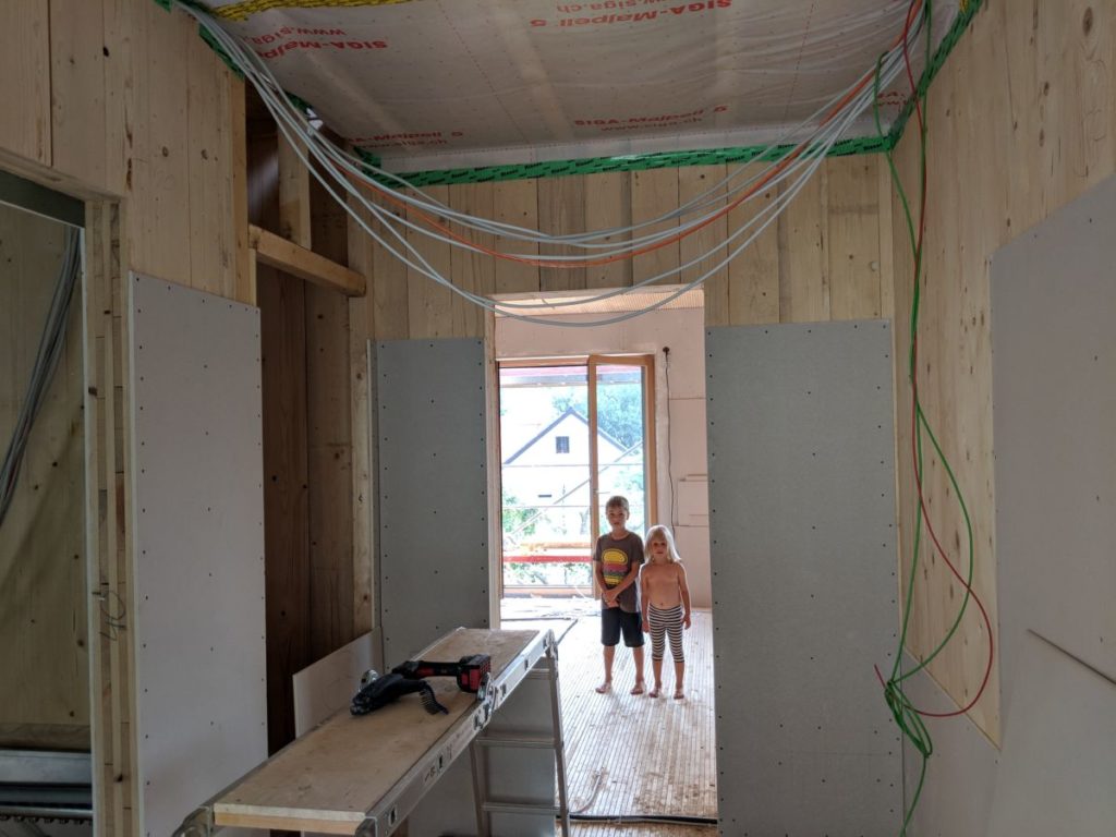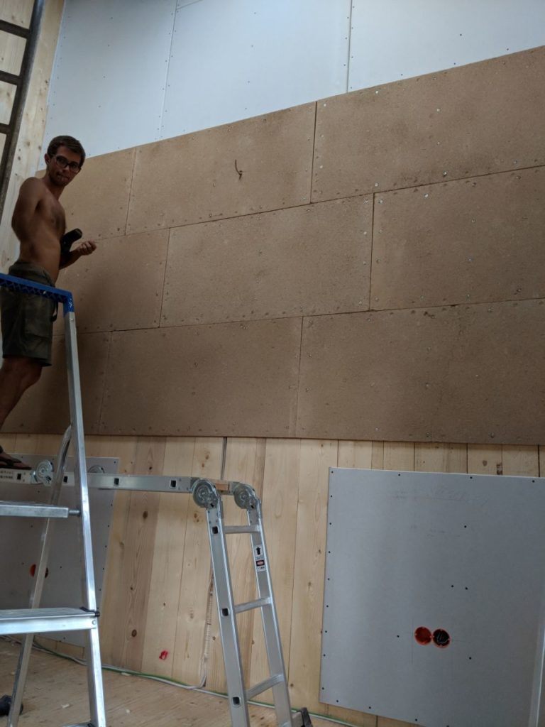 Erster Rückbau. Wir haben dank optimalem Zuschnitt zehn Lehmplatten übrig, deutlich mehr als erwartet. Jetzt tauschen wir im Schlafzimmer Gipskarton gegen Lehm. Es reicht zwar nur für einen Streifen, aber besser als nichts, immerhin noch 6,12 Quadratmeter.