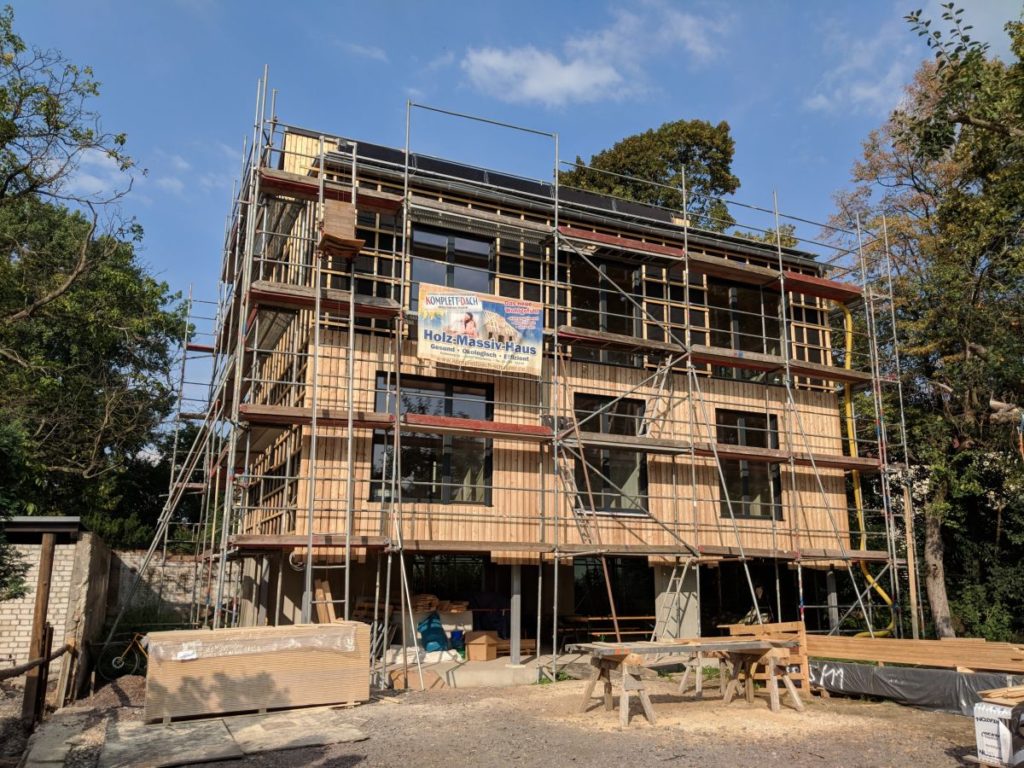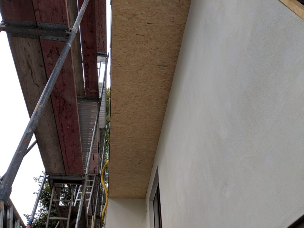 Außen ist die Decke mit geschliffener OSB-Platte verkleidet worden. Das sieht ganz anständig aus. Vielleicht irgend eine weiße Lasur drauf?