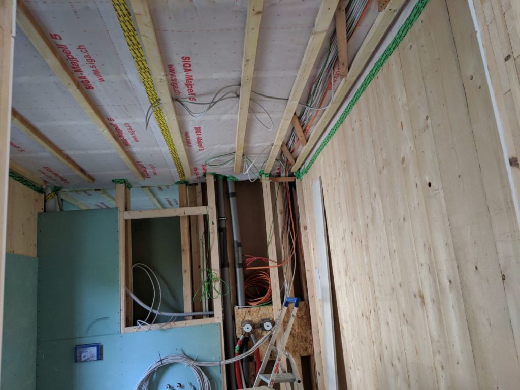 Heute habe ich die Kabel durchs Bad geführt, nacdem wir die Latten an der Decke angebracht hatten.