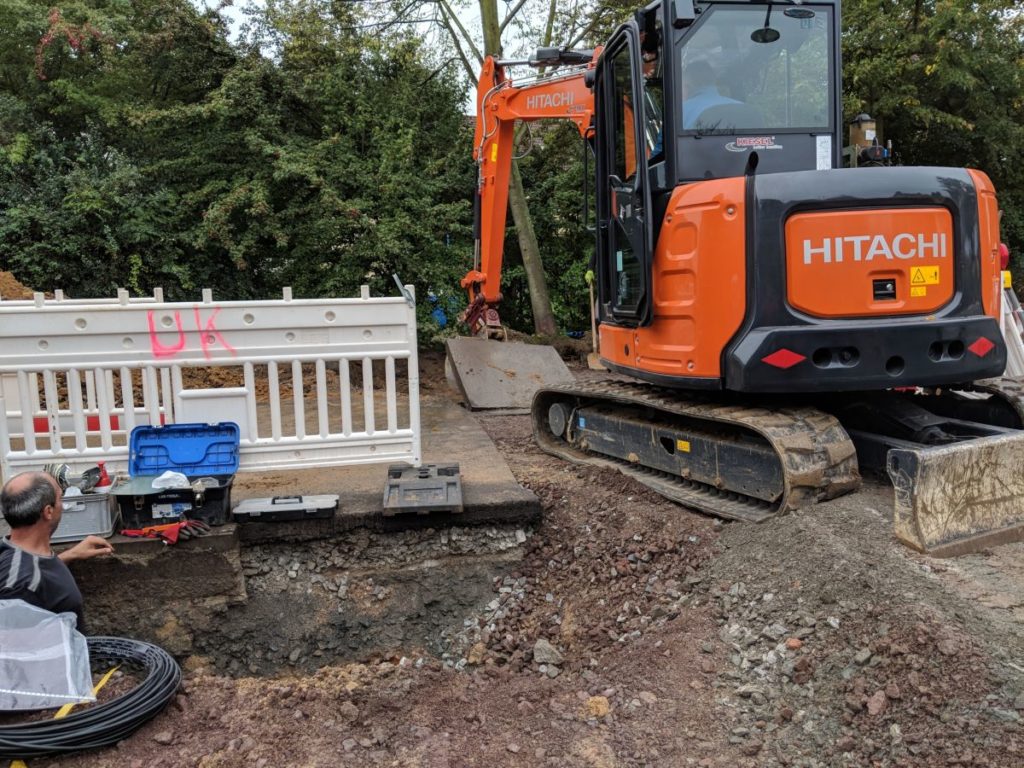 Nach der Nachtschicht wieder auf die Baustelle. Leerrohre und Trinkwasserschat sind da (rechts im Bild).