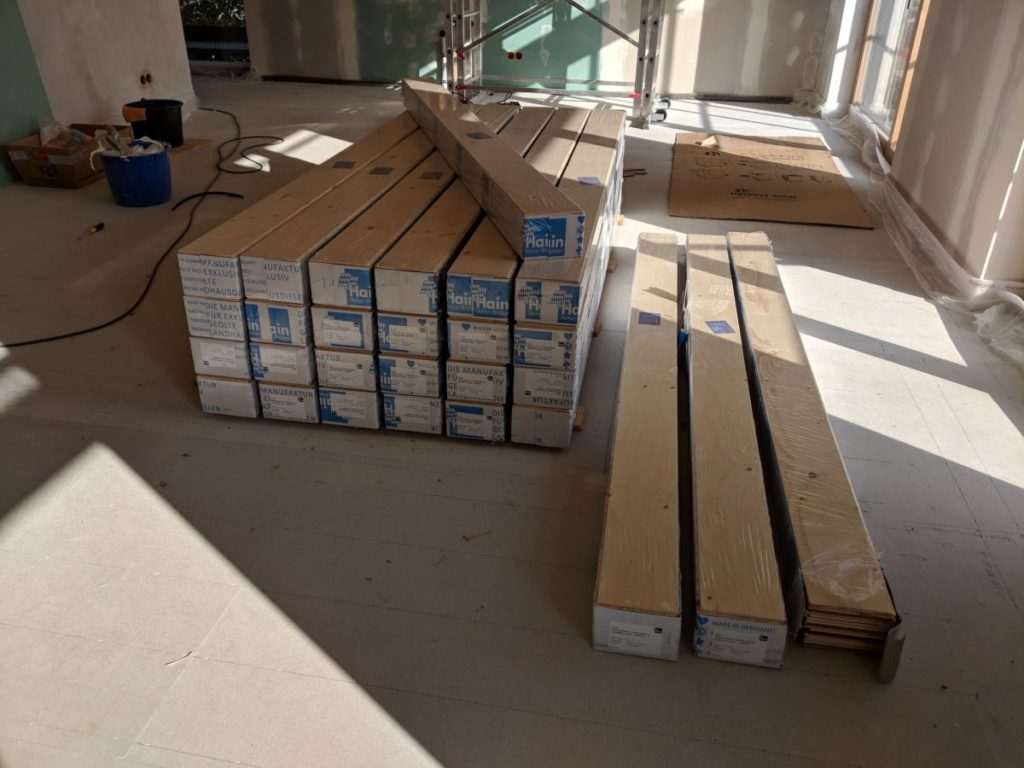 Der Fußboden ist fertig, das Wetter wird feuchter. Unsere Dielen sollten eigentlich nie draußen liegen. Unter dem Haus hatten sie zwar einen guten Platz, aber nun müssen sie hoch… über eine Tonne.