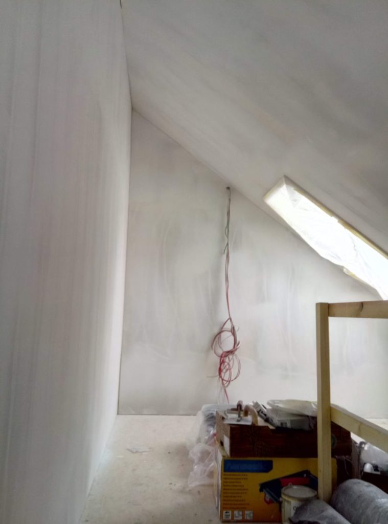 Doch der Spitzboden ist nicht fertig,also verdünne ich die Farbe.