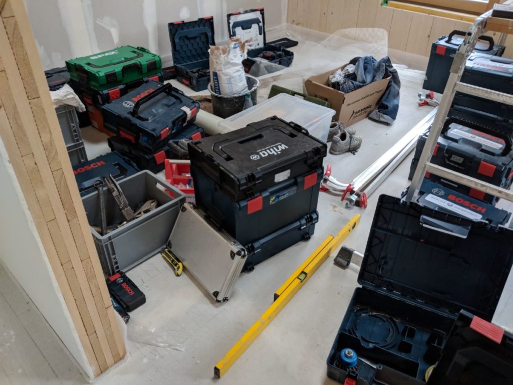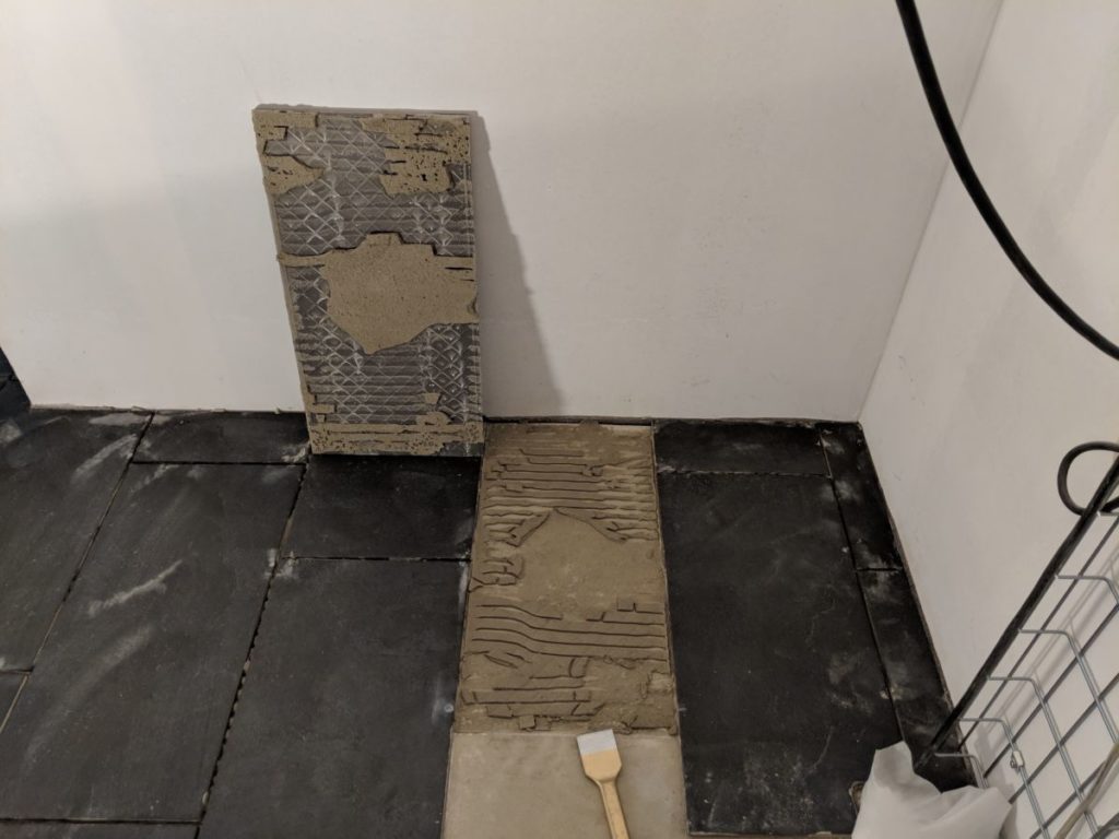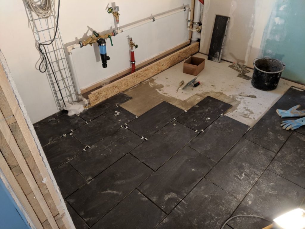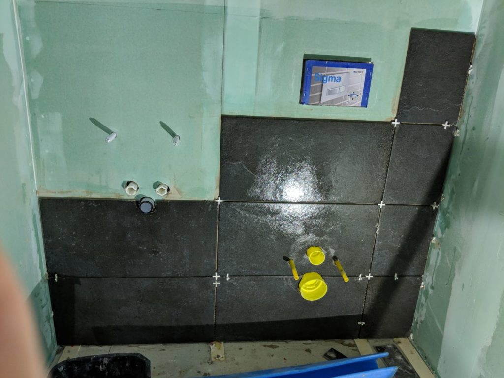 Im Technikraum hatte ich gestern Abend doch einen Fehler gemacht und eine „falsch“ Fließe geklebt, sodass das Muster nicht stimmte. Man hätte es auch so lassen können, aber ich wagte einen Korrekturversuch – die Fliese ging erschreckend einfach ab. Ab das an dem etwas steifen Kleber gestern abend lag? Ich dachte ich habe 2 Stunden Zeit zur Verarbeitung, heute musste ich lesen: 30 Minuten Klebeoffen. Ich hoffe die Fliesen bleiben kleben… notfalls steht ja der Wassertank drauf 😉
