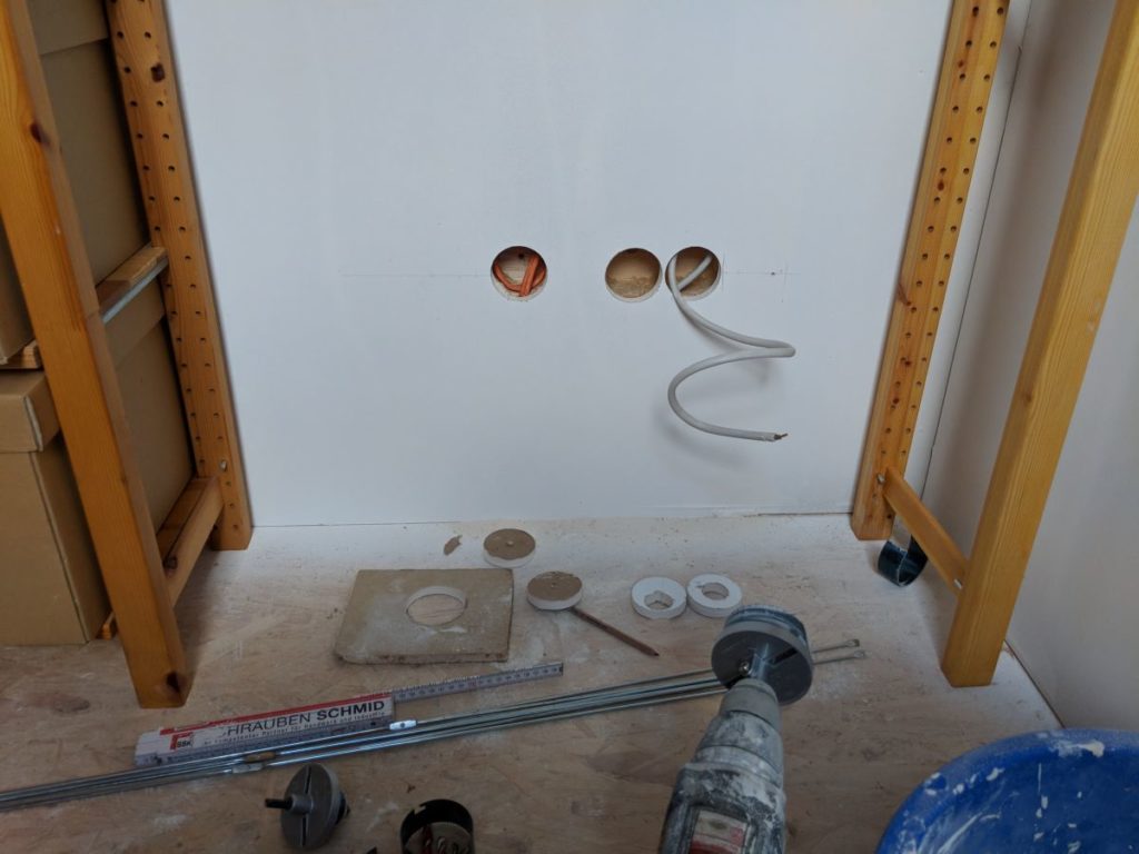 Hier wurden meine Markierungen der Steckdosen überstrichen. Mit Geschick, Sachverstand und etwas Glück habe ich die Dosen gefunden und nur eine 4 mm Bohrung fehlplatziert (Dort war die Dose Ursprünglich gefräst, nun liegen aber die Kabel durch, sodass ich nachträglich eine neue Netzwerkdose ausgeschnitten hatte.)