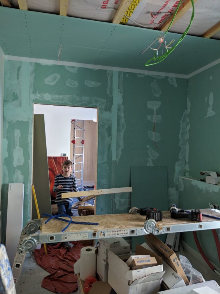 Läuft das ganz gut. Der Gipskarton war zum Glück alle. Jetzt habe ich mir kleinere Platten gekauft, was die Montage erheblich erleichtert. Die Teile scheinen auch von höherer Qualität, denn sie haben Fasers (Glas?) drin. Bricht zwar nicht so schön, aber wirkt fester. An schrauben habe ich nicht gespart.