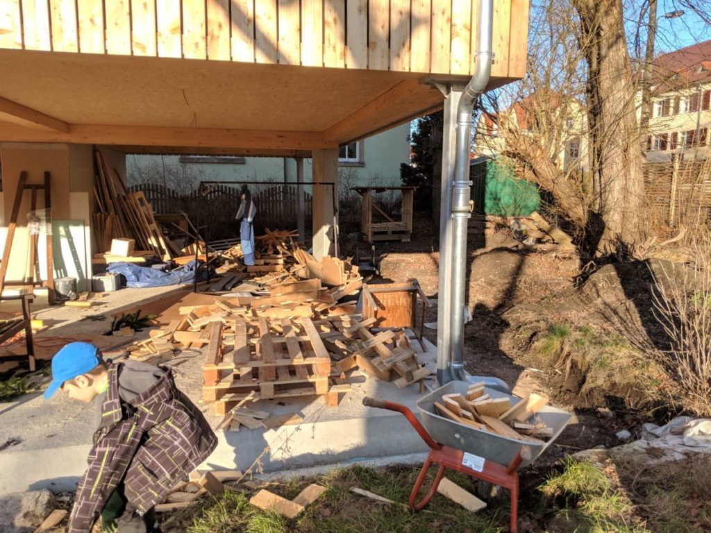 Überall liegen Holzreste herum. Da muss ein Holzstapel her.