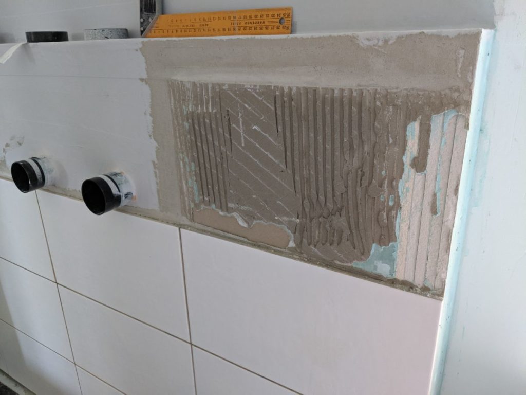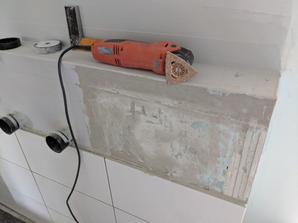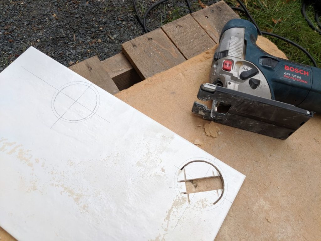 An den Fußbodenfließen, welche wir auch an der Wand haben, bin ich gescheitert, da ging das Blatt kaputt ohne vorwärts zu kommen. Aber die Wandfließen schneiden sich wie Butter. Sehr geil, denn die Position des Loches ist denkbar ungünstig.