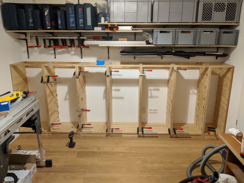 Das Werkstattregal wurde zu einem ganzen Stück verschraubt und an die Wand gespaxt.