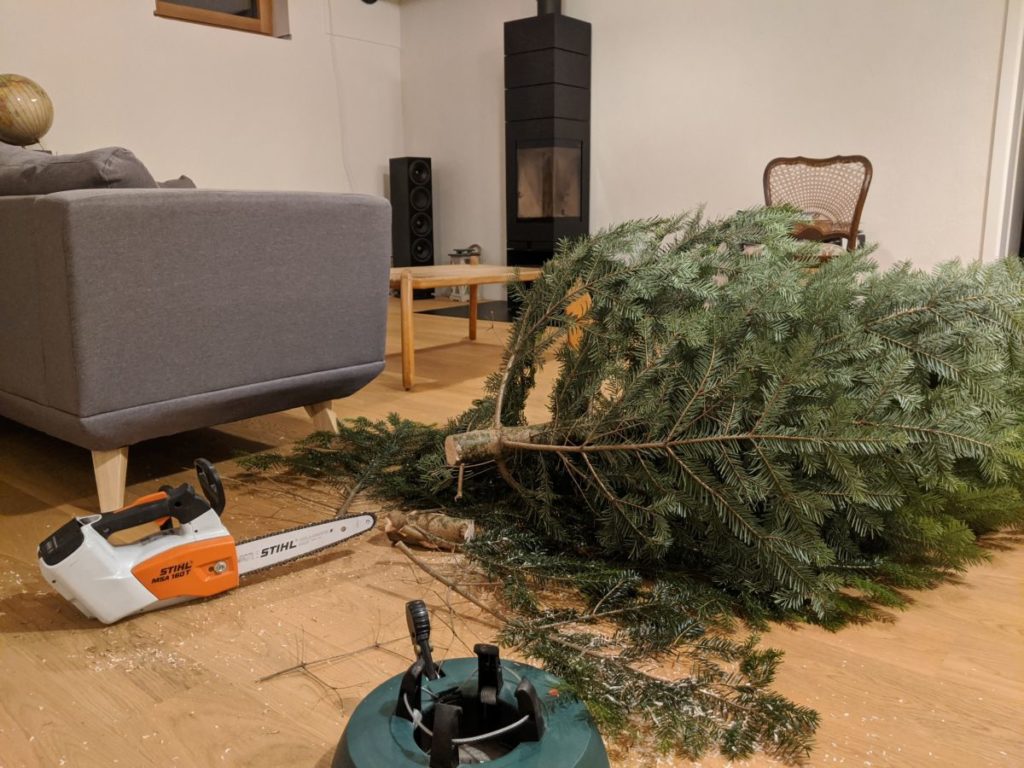 Und heute muss auch noch der Baum schnell eingepasst werden. Warum lange Fackeln wenn eine leistungsfähige Säge zur Hand ist?