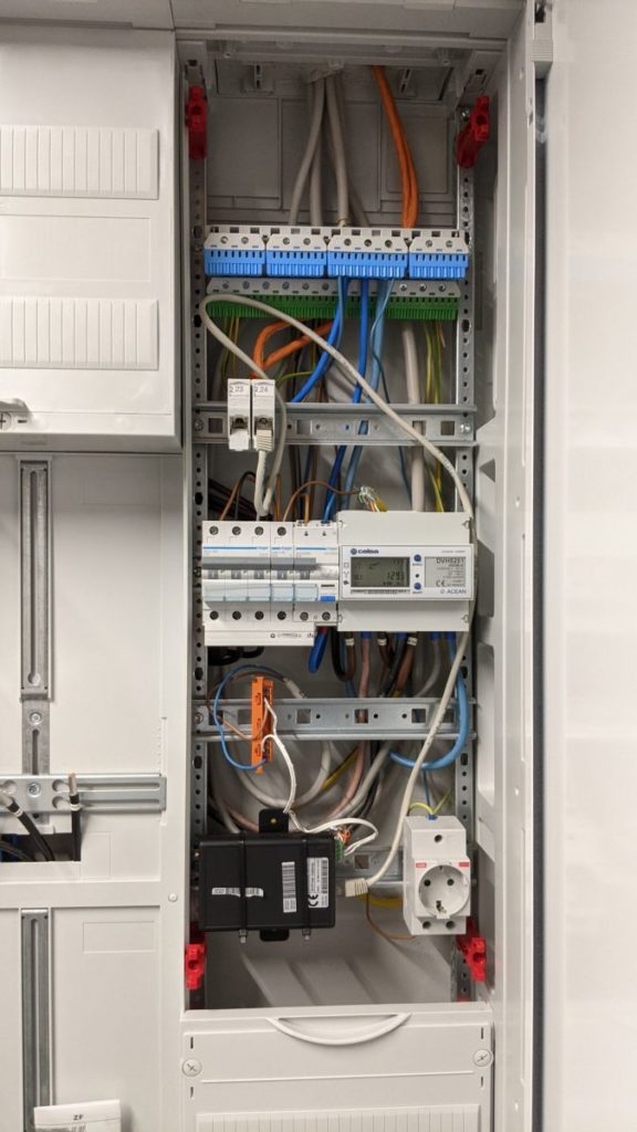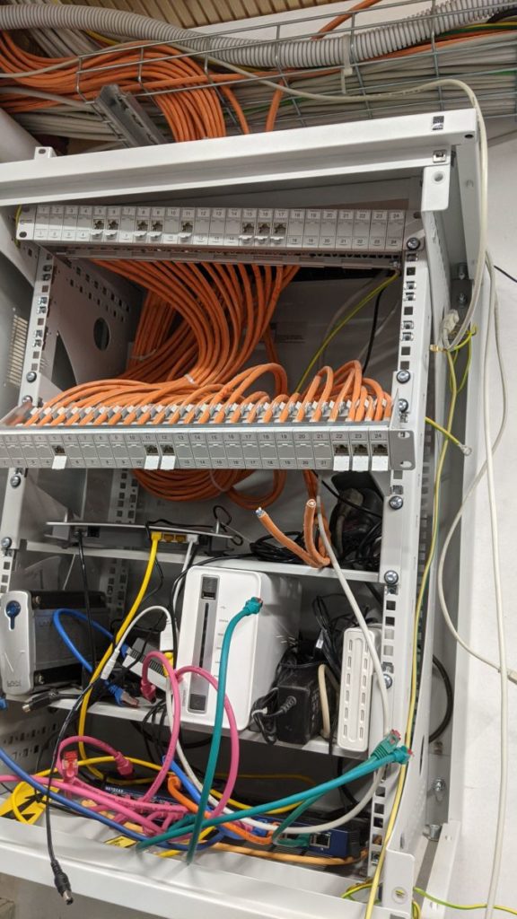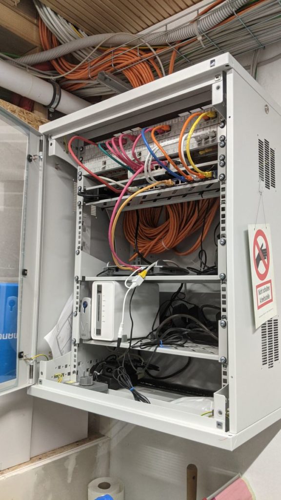 Nun ist der Netzwerkschrank auch ordentlich mit dem Potentialausgleich verbunden und seine Einzelteile durchkonektiert (der Elektriker hatte die Grün-Gelbe Ader nur in den Schrank gehängt).