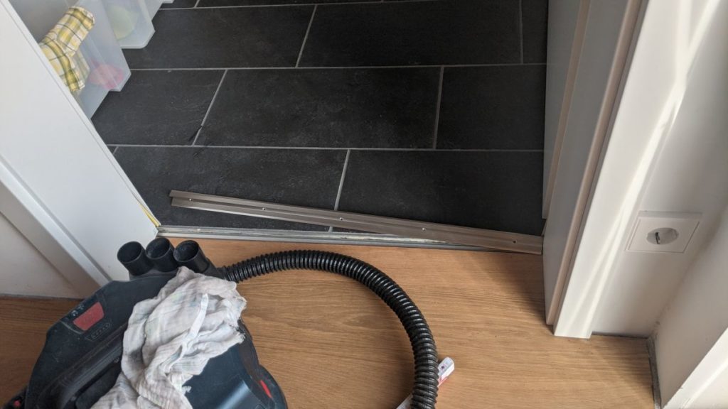 Die Anschluss-Fugen zwischen den schwimmend verlegten Dielen sollen unter Aluprofilen verschwinden. Dazu wurde vorher ein Gegenstück aus Alu auf den Trockenestrich montiert. Die Leisten sollen unter den Türen verschwinden. Das ist einigermaßen gelungen, aber man hätte die Dinger auch kürzer machen können. Insgesamt finde ich das eines der kompliziertesten Details im Innenausbau.