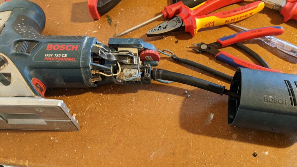 Dabei ging die alte zweit-Stichsäge (Bosch GSR 135) kaputt – Kabelbruch. Ein gutes Werkzeug lässt sich sehr einfach reparieren…