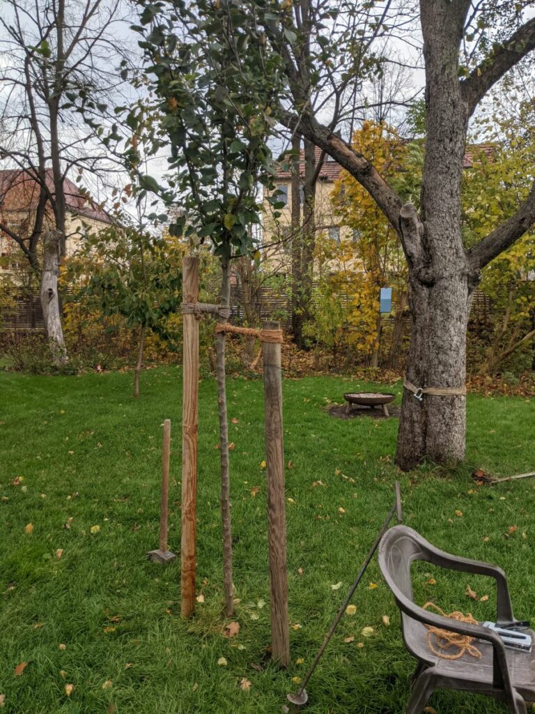 Der Apfelbaum braucht bei dem Sturm einen zweiten Pfosten