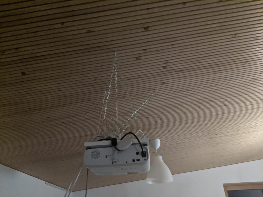 Nach über einem Jahr Provisorium steht der Entschluss: Der Beamer muss an die Decke. Ein erster Versuch mit Ketten war fulminant gescheitert, die Schaukelei war unbeherrschbar.