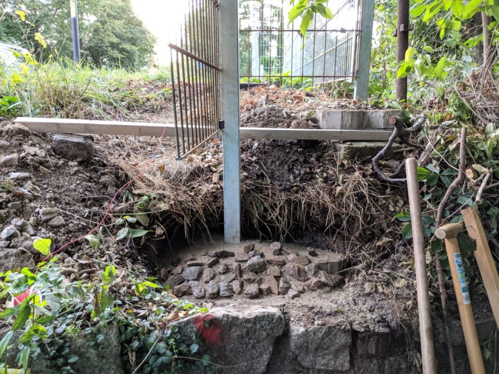 Unter fadenscheinigen Baumschutz Argumenten möchte die untere Wasserbehörde den Zaunbau nicht genehmigen, da hier wegen der Baumwurzeln keine Fundamente einzubringen sind.