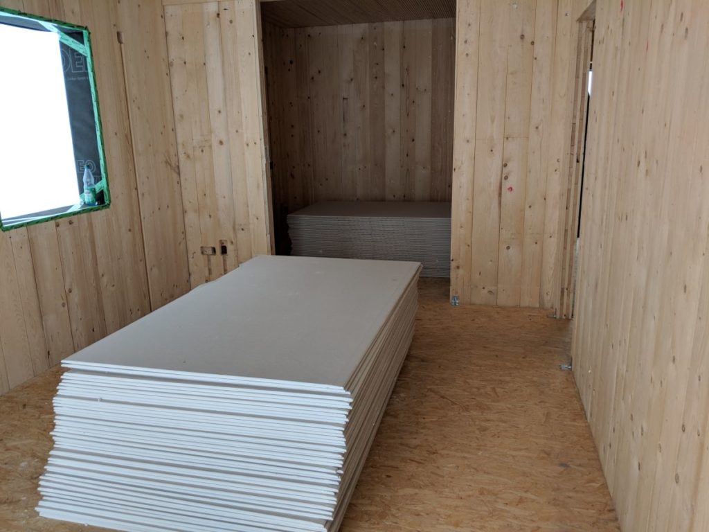Zwischenzeitlich wurde Gipskarton geliefert. Der Trockenbau kann starten.
