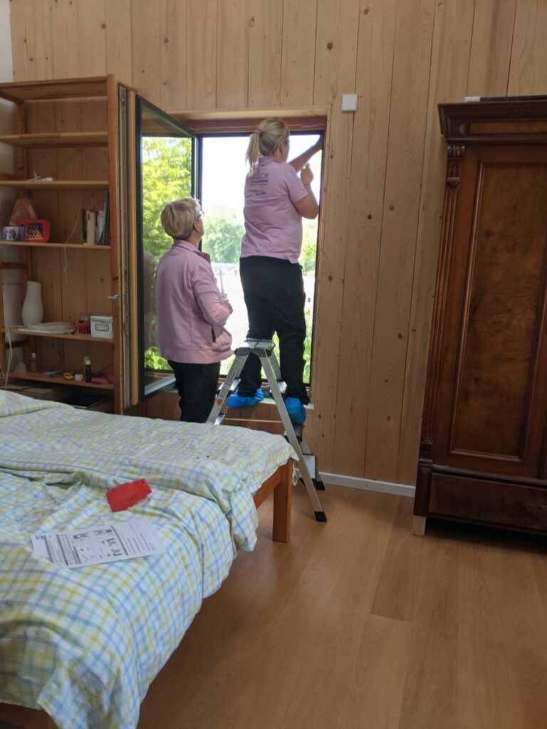 Zwei Frauen montieren das Pollenschutzgitter. Ein teurer Spaß, aber dafür eine ganz vernünftige Lösung bei offenem Fenster schlafen zu können.