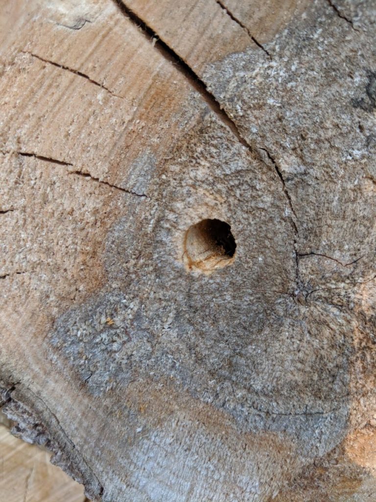 irgendwer bohrt diese Löcher in das schlechte Holz in meinem Holzstapel. Sieht aus wie schwarze Hummeln…