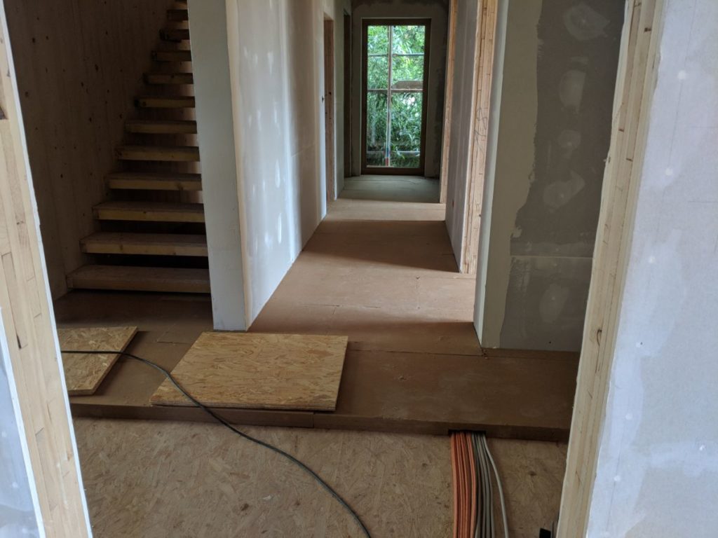 Anabelle hat im ersten Obergeschoss die erste Fugenspachtelung überall verschliffen. Ich war nur kurz nach dem Dienst da und habe die letzten paar Zentimeter Kabel in den Schlafzimmerfußboden eingefräst.