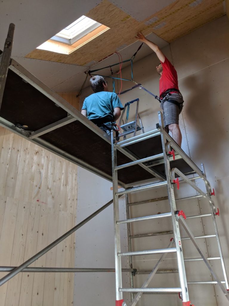 Vor der Arbeit noch schnell das kleine Bad und das Fenster im Technikraum verspachtelt. Anabelle hat Geschliffen, Heinrich Alu-Ecken angetackert und der Fensterbauer die Haustür montiert.